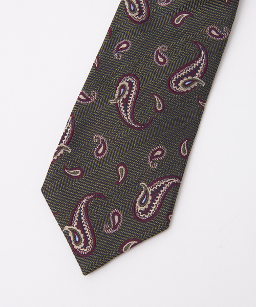 大小のペイズリー柄が個性的なネクタイ。落ち着いた色合いとシルクの上品なツヤ感が派手すぎず、大人の胸元を華麗に演出してくれます。