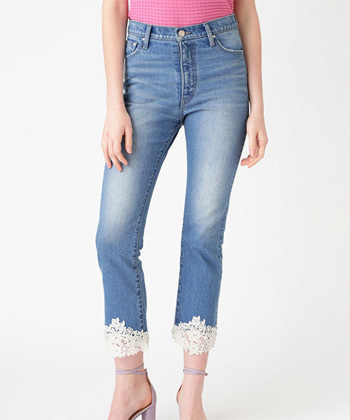 夏らしい裾レース付きのクロップドデニムパンツ。微ストレッチ素材で、苦しくないようハイウエスト過ぎない仕上がりです。少し裾をフレアにした今年らしいシルエットと、裾にオリジナルレースをつけたフェミニンなデザインです。クロップド丈で、足元に軽いニュアンスを出せるのでサンダルとも好バランス。ブラウスや薄手のニット、Tシャツ合わせでもフェミニンさをプラスできる一本です。