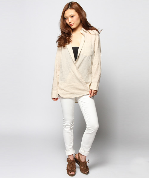 これからのシーズンにピッタリの麻混の通気性の良いシャツです! ボーイズサイズのゆったり感と麻のくたっと感が大人のニュアンスを引き出します。その日の気分でアレンジできる2WAYタイプでカシュクールでも着用可能。 胸元がぐっとあくので、インナーやネックレスで楽しめます。 ホワイト系のボトム合わせなど、全体的に明るいカラーで合わせるのが今年のマストスタイル☆ オフホワイト: model:H:165 B:83 W:60 H:85 着用サイズ:FREE model:H166 B86 W56 H78 着用サイズ:FREE