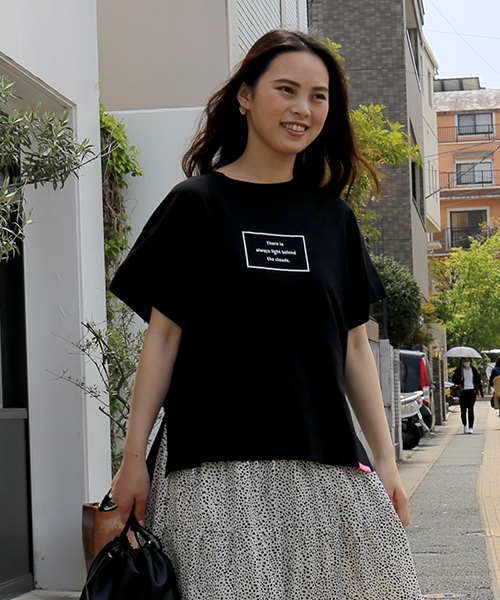 1枚は欲しい☆ロゴTはシンプル大人っぽいロゴで♪着回しできる、シンプルロゴTは、再度のスリットが、チョッピリ深めでフロント裾のピンクタグがアクセント。オーバーサイズで、大人女子のカワイイTシャツは、キレイめスカートに合わせたり、だぼっとゆったりバナナパンツに合わせたり。色んな着こなしが出来ます♪