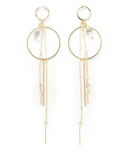ゆれるモチーフが表情を豊かに見せてくれるイヤリング。 クリアストーンを使って涼しげに仕上げたアイテム。 様々なデザインのチェーンを使い遊び心をくすぐられる。 ★素材の特性上、カラーが、写真と多少異なる場合があります。 ★真鍮なので錆びにくい素材です。 ★金属アレルギーの原因となるニッケルをほぼ含まず、アレルギーの方にも安心なニッケルフリー加工でお肌に優しい素材です。 ★耳たぶをはさむタイプのイヤリングです。