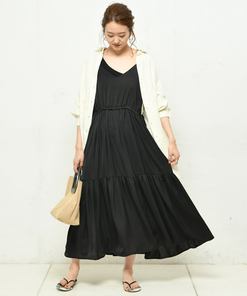 ストンと落ちるラインとシャーリングデザインが魅力的なフェミニンなキャミワンピース。落ち着いた肌なじみの良いカラーリングで肌を明るくきれいに見せます。3段切り替えとシャーリングがボリュームを出し、華やかな印象を与えるアイテム。1枚でさらりと着ても、Tシャツやキャミソールをインしても着られ、合わせるアイテムで雰囲気が変えられます。