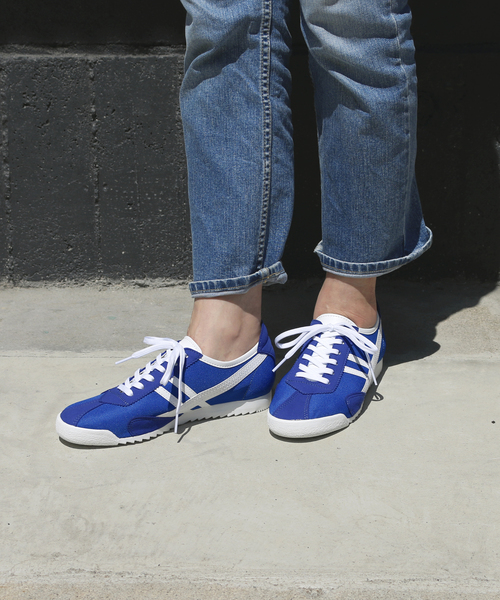 One Mile レースアップスニーカー アッパーのサイドにあるパーツが特徴的なスニーカー。ブルーとホワイトはキャンバス素材。ブラックはナイロン調です。 様々な服に合わせやすく、細身なシルエットで女性らしさをプラスしてくれるシューズです。 かかとにあるパーツで脱ぎ履きがしやすくなっており、『ブラック』『ブルー』『ホワイト』のシンプルな3色展開です。