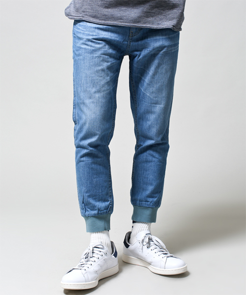 ◆Shama◆(シャマ)『リラックス感のある絶妙なシルエット』ライトオンスのデニムパンツのスソをリブ仕様にしています。前のベルトループの一部とバックのシンチバックル部分にディアスキンを使用。shamaらしいスッキリとしながらも春夏らしいリラックス感あるシルエットとなっています。皮靴やスニーカーとも相性の良い1本です。 model:H175 B73 W71 H80 着用サイズ:38