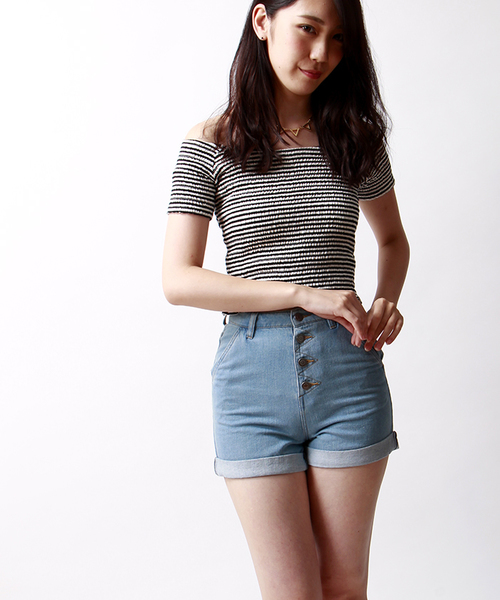 【ViVi 6月号掲載商品】 人気のハイウエスト仕様で仕上げたショーツ。トップスをインした際にウエスト周りのシルエットが綺麗に見えるひと品です。定番の合わせやすさはそのままに、フロントボタンが手軽に着こなしのアクセントに。また、ロールアップデザインを採用することで足長効果があり、レッグラインを細くスッキリと見せてくれます。今季はハットやスニーカーと合わせるような着こなしもオススメです。 ▼このアイテムを使った特集ページ < TREND LOOK "夏→秋にスイッチ" > model:H175 着用サイズ:LARGE 詳細画像 model:H161 B80 W58 H88 着用サイズ:MEDIUM ホワイト詳細画像 model:H170 B81 W65 H88 着用サイズ:LARGE WEGOの特集ページはコチラ