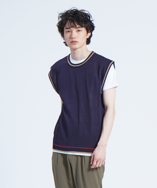 コーディネートのアクセントに 【素材】さらっとした肌触りのアクリル素材を使用。軽い着心地で春夏に最適です。 【デザイン】 首周り、裾のラインがポイント。 【コーディネート】 ビッグシルエットのTシャツと合わせたり、トレンドのサコッシュやワイドパンツ、イージーパンツやショートパンツと合わせるなど、幅広いスタイリングにマッチします。 ホワイト モデル:H185 B86 W72 H93 着用サイズ:48 ネイビー モデル:H185 B86 W72 H93 着用サイズ:48 ブラック モデル:H185 B86 W72 H93 着用サイズ:48