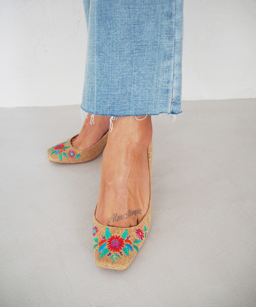 足元を華やかに魅せる、フラワーエンブロイダリーパンプス。 つま先とヒールに繊細な刺繍を施し、360度どこから見てもデザイン性の高い一足に仕上げました。 ナチュラルな風合いのコルクが、程よく抜け感を演出してくれます。 カジュアルなデニムと合わせたスタイリングが、女性らしい着こなしにきまるのも魅力です。 ※モデル着用画像はイメージのため、実際の商品のお色と異なって見える場合がございます。 商品の詳細画像が実際の商品により近いお色となります。