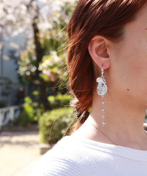 貝殻モチーフと淡水パール、ビーズチェーンを組み合わせたインパクトのあるピアスです。夏らしいデザインで、アップヘアスタイルによく合う大ぶりなサイズです。インパクトはありますが、シルバーとゴールドのカラーが大人の方にも使い易いデザインになっています。