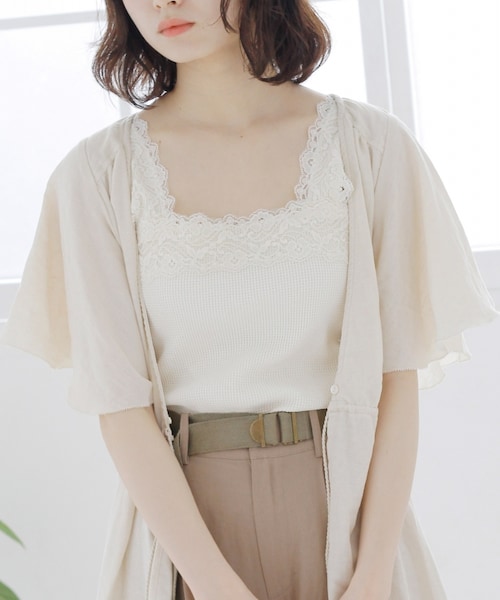 胸元や肩紐の繊細なレース使いがレディライクなキャミソール。 トップスやアウターのレイヤードに1枚あると便利なアイテム。 やわらかな肌触りの生地で着心地も抜群です。 ダークブラウン、アイボリーの2カラー。