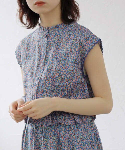 裾のフリルやレースのディテールが女性らしいフラワーブラウス。 フレンチスリーブとコンパクトなシルエットがすっきりと大人っぽい印象に。 シリーズのスカートと合わせてワンピース風に着こなすのもおすすめ。 ブルー、ネイビーの2カラー。