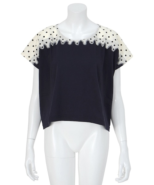 ドットをプリントしたレース素材と無地をドッキングさせた半袖カットソー。ワイド・シルエットがポイント。Torso:H163.5 B80 W58.5 H86 着用サイズ:02サイズ