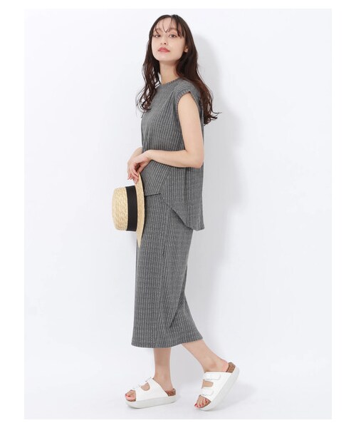表情感のあるワイドリブの生地を使用したノースリーブトップスと、タイトスカートのセットアップ。 セットで着用するとワンピースのように着ることができ、ほどよい抜け感のある女性らしい着こなしに。 どちらもシンプルで着まわしやすく、お手持ちのアイテムと組み合わせればスタイリングの幅が広がります。