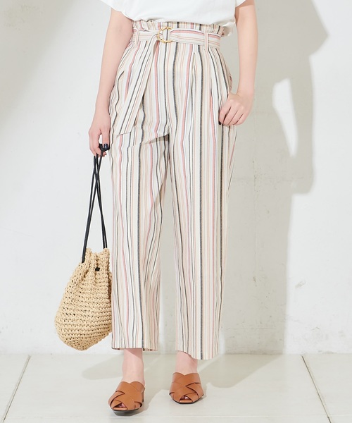 【2019SS natural couture】リラクシーな履き心地にスタイルUPも叶うワイドパンツ毎回大好評を頂戴しているベルト付きパンツに新作が登場です。今回は春夏シーズンにぴったりなウッド調の丸カンベルトになっており、季節感のある装いに。脚長効果のあるハイウエストに、ストンとしたワイドシルエットがレッグラインを逃してスタイルUPを叶えてくれます。少しゆったりとしたサイズ感でリラクシーな履き心地です。これから先の汗ばむ季節にもぴったりな1着。どんなトップスにも合わせやすい無地と涼しげなランダムストライプ柄の2パターンご用意!