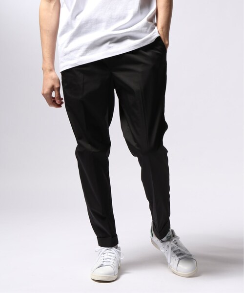 美しいテーパードシルエットが魅力的なEDIFICEオリジナルのアンクルパンツ。裾をダブル仕様に仕上げ、すっきりとした足元にアクセントを付けています。コットン×ポリエステル素材を用いたハリのある生地は、ウエスト周りの立体感を演出するプリーツ入りのパンツと相性抜群。シャツやカットソーをタックインしたスタイリングにもオススメです。ブラック・ベージュ・カーキの合わせやすい3色を取り揃えました。モデルサイズ:身長:178cm バスト:85cm ウェスト:70cm ヒップ:88cm 着用サイズ:L