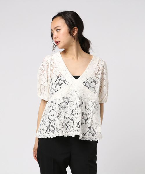 落ち着いた大人可愛い印象のカシクール風デザインのレースブラウス。 胸元のV字開きのラインがデコルテを綺麗に見せてくれます。 袖はふんわりバルーンのシルエットで可愛らしさも忘れずに ウエストはスタイルアップしてみえるように高めの位置で切り替えをいれております。綺麗目にまとめても、カジュアルで着崩したスタイルもどちらもおすすめ◎ネックがすっきりと開いているのでスカーフなどの小物とも相性抜群です