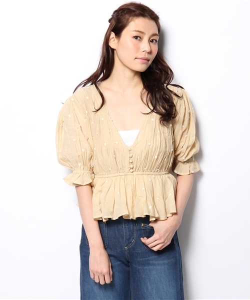 ロマンティックなデザインが魅力の「MES DEMOISELLES...」のパフスリーブブラウス。 薄手で程良い透け感が涼しげな印象を与えてくれるコットン・レーヨン混紡の素材。それぞれのカラーにマッチした、刺繍糸がドット柄を描きます。深めのVネックラインやウエストギャザー、5分袖のパフスリーブが繊細で女性らしいシルエットに。コンパクトな丈なので、ハイウエストパンツやマキシスカートなどのボリュームのあるボトムスとのコーディネートがお勧めです。 MES DEMOISELLES... / メドモアゼル パリのサロンやブティックをはじめ、世界中の高感度セレクトショップに人気のブランド「MES DEMOISELLES...(メドモアゼル)」はフランス人デザイナー、ANITA(アニタ)が手掛けるブランド。“いくつになっても、誰もがマドモアゼルであって欲しい”というコンセプトを元に展開されるヨーロッパの様々な要素を取り入れた彼女のスタイルは、シルクや刺繍を多様したエレガントで可愛らしいデザインが特徴です。 ※詳細は参考カラーです。 店舗へお問い合わせの際は下記品番をお伝えください。 品番:61-01-0160-077