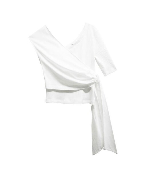 ワンショルダーのカットソーにアシンメトリービスチェをレイヤードしたデザイントップス。