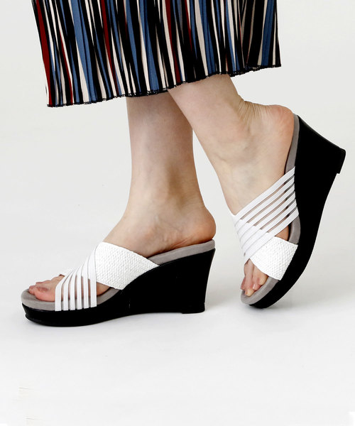 ストライプ柄とナチュラル柄のMIX幅広ゴムでスポーツMIXサンダル。ブラックソールでクールで都会的な印象に。裸足で履いても気持ち良いスウェード調の中底巻き材を使用していて、幅広設計で足を包み込むような快適な履き心地に。前にも厚みのあるので高さを感じず履けて屈曲性のある柔らかウェッジソールと疲れにくい低反発クッションインソールで歩きやすく、脱ぎ履き楽々で足をすっぽり包み込む甲深サンダルは、夏のお出かけをアクティブにしてくれます。==< サイズ詳細>==================== サイズ/cm■S (22.5cm)■長さ:24.0cm ワイズ:20.75cm 幅:8.4cm ヒール高さ:7.5cm■M (23.0-23.5cm)■長さ:24.5cm ワイズ:21.1cm 幅:8.5cm ヒール高さ:7.5cm■L (23.5-24.0cm)■長さ:25.0cm ワイズ:21.45cm 幅:8.6cm ヒール高さ:7.5cm■LL (24.5cm)■長さ:25.5cm ワイズ:21.8cm 幅:8.7cm ヒール高さ:7.5cm※サイズスペックについては、VivianCollection独自の方法により採寸しております。