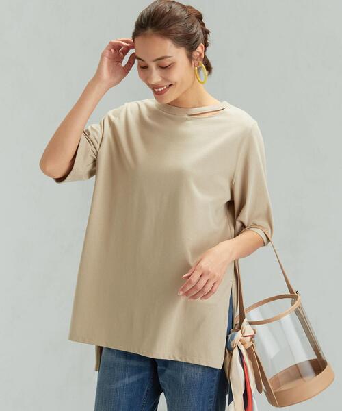 『誰もがリアルに着たい服をカタチに』をテーマにショップスタッフが開発したシリーズが今シーズン初登場!<1枚でサマになる><上質素材でケアしやすい><着回しがきく><ワードローブにない>をキーワードに開発したこだわりのシリーズです。“1枚で映えるデザインカットソー”をテーマに開発したロング丈Tシャツ。ネックとサイドのスリットデザインが今年らしい一着です。さらりと柔らかな着心地のコットン素材は、程よい張り感もポイント◎透け感もなく1枚で安心して着用いただける素材感と、長めの袖丈、ダークカラー展開で暑い季節~秋口まで活躍するトップスに仕上げました。デコルテ部分のスリットは、露出しすぎず且つお洒落にワンポイントになる大きさにこだわりました。サイドスリットの部分にカシメ金具をプラスし、カジュアルすぎず幅広いシーンで着用いただけるようにデザイン。パンツでもマキシ丈スカートでも合わせられるスリットの深さや丈感は、レイヤードスタイルはもちろん、ウエストインスタイルも楽しめます!インナーに白Tシャツを着用し、デコルテスリットからちらりと覗かせる着こなしもおすすめ♪※スリット部分のカシメは、ベージュ・ワイン:ゴールド、ダークグレー:ブラックニッケルになります。※照明の関係により、実際よりもやや明るく見える場合がございます。またパソコンなどの環境により、若干製品と画像のカラーが異なる場合もございます。予めご了承ください。店舗へお問い合わせの際は、全国のgreen label relaxing各店舗まで下記の品名/品番をお申し付け下さい。 品名:SC MGHT デコルテスリット ロングT 品番:3617-225-2584