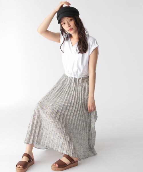 Vネック×フレンチスリーブが涼しげなドッキングシフォンワンピース。上身頃はカットソーになっているので、夏でも着やすいのがうれしいポイント。背面にはギャザーが寄せられ、後姿もキレイなデザインになっています。細かなプリーツが女性らしさを際立たせ、これ1枚で上品な仕上がりに◎