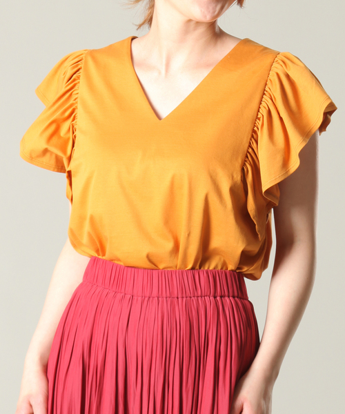 袖フリルがポイントのカットソー ハリ感がある素材はカットソーながらブラウスのように着て頂けます。 袖のボリュームとVネックのバランスがスッキリと華奢に見せてくれます。 スリットが入ってることで、出して着てももたずかず、安心感のある丈感になってます。
