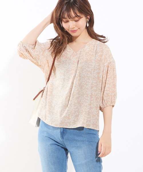 【2019SS natural couture】人気のプチプライス・シリーズ!ふんわり軽やかな印象に。プチプラブラウスシンプルながら、ひねりを効かせたバックデザインがおしゃれなブラウス。ゆとりのあるシルエットでふんわりとした印象に仕上げてくれます。Vネックに開いた首元はお顔周りをスッキリと、七分袖になった袖は手元を華奢に魅せてくれます。袖口がゴムになっているので、たゆんとしたボリューム感があるのもポイント。程よい長さのある着丈は、様々なスタイリングにぴったり。INでもOUTでもお楽しみいただけます。定番のオフや、柔らかなベージュ、ミント、優しい色合いの花柄、そして爽やかなストライプをご用意しております。