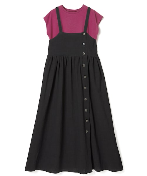 Tシャツとジャンスカがセットになり、即旬なコーデが完成するアンサンブルが登場。 ハイウエストにたっぷりギャザーをいれ、量感たっぷりのスカートに一目惚れ。 フレンチスリーブが二の腕をさりげなくカバーしてくれる。 セットではもちろん、お手持ちのアイテムとの組み合わせも幅広く楽しめる。 ★ワンピースとTシャツの2点セットです。 ★ワンピースの身頃部分は裏地付きです。 ★バックウエストゴム入りです。 ★肩紐はボタンの位置によって長さ調節可能です。 ★Tシャツは伸縮性があります。
