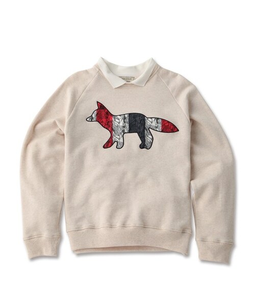 【MAISONKITSUNE】ボディにPOLOシャツのようなニット襟が付いたスウェットプルオーバー。フロントにはアイコニックなトリコロールのKITSUNE柄のプリントが施されています。デザインコンシャスで、1枚で合わせてもキュート。