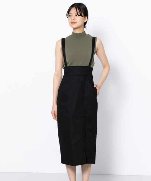 ベーシックで細みなシルエットが女性らしい一着。アイラインで着やせ効果も期待大。トップス次第できれいめからカジュアルまで幅広いスタリングを楽しんでいただけます。サスペンダー付きで、取り外せばスカート単体としても活躍する着回しの効くアイテムです。