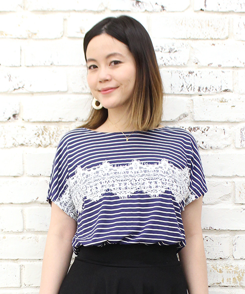 mystic 夏の定番のボーダーにレースデザインを加えたTシャツ。あえて花柄のスカートを合わせて、柄×柄のコーディネイトもお勧めです。 さらりとしたレーヨン素材で、肌触りも抜群です。 ※画像の商品はサンプルです。 実際の商品と仕様、加工、サイズが若干異なる場合がございます。