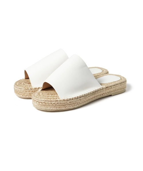 アッパーのエコレザーが主張しすぎない大人な印象のフラットサンダル。 ナチュラルなジュート素材でカジュアルながらもオシャレに履きこなせる。 フラットヒールで歩きやすいところも嬉しいポイント。 デニムからマキシスカートまで夏らしい着こなしにピッタリの1足。 ★低反発クッション入りです。