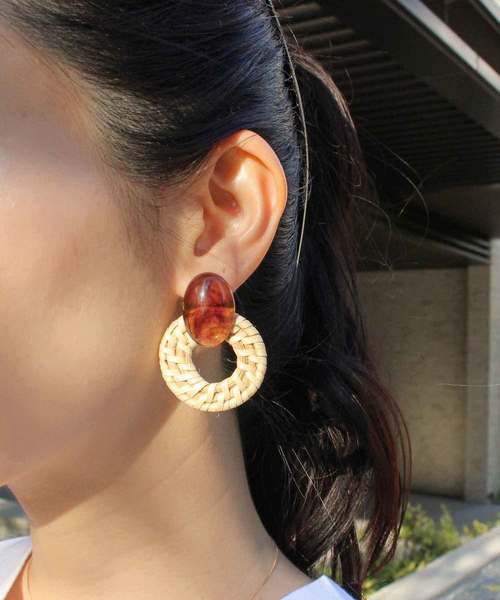 軽いラタン素材のピアス・イヤリングは存在感のある デザインで夏のリゾートにもぴったり♪ ※無理な力が加わったり、水気や湿気が原因で破損する恐れがございますので、 お取り扱いには十分ご注意下さい。