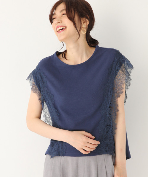 ★ほどよいレースがかわいい★ 表面感の有るリップル素材と女性らしい華奢なレースを 組み合わせたデザインカットソー。 肩のレースが程よく二の腕をカバーしてくれて、 前後差のある着丈でヒップも隠れるので、安心して着れるアイテムです。 スカート合わせでフェミニンにも、デニム合わせでカジュアルにも合わせられるので ボトムスを変えて、印象の違うスタイリングをお楽しみいただけます。