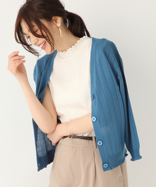 透け感のでる軽やかカーディガン 縦にながれるハリヌキ柄で透け感が出て、軽やかな印象のカーディガン。 薄手の素材なので持ち運びもしやすく、日差しが強くなるこれからの時期にも使いやすい1枚です。 ジャストの着丈は合わせるボトムも選ばず、ご自宅でお手入れしやすいのも嬉しいポイント。