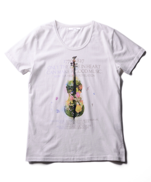 花と楽器をコラージュしたレアセルらしいアレンジの効いたグラフィックです。『純粋な心こそが良質な音楽を作り出す』というメッセージ入りになっています。ボディーによく馴染むインクジェットプリントを施しています