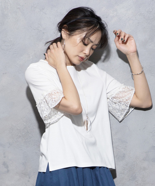 スリーブにレース素材をあわせたTシャツ 滑らかな生地のTシャツは、 スリーブに透け感のあるレース素材をあわせ、 涼しげな印象をプラス。 ふんわり広がるスリーブが 女性らしいラインを作ります。 ワイドパンツやロングスカートと あわせたスタイルがおすすめです。 モデル身長:165cm Mサイズ 着用商品詳細のところにある【ハートマーク】をクリックして、 お気に入り登録をしてくださいね! 嬉しいお知らせが届くようになりますよ!