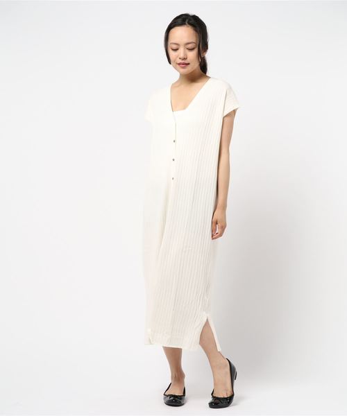 UVカット加工を施した、これからの季節にうれしいカットソー素材のワンピース。前後どちらを前にしてもOKな2way仕様で、クルーネックとVネックのどちらも楽しめます。ご家庭の洗濯機で洗えるので、気軽に着ることができ、デイリーユースにぴったりです。