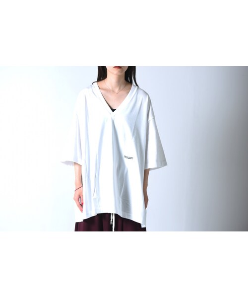 深いVネックのコットン天竺Tシャツ。 夏場に一枚でインパクトのあるオーバーなサイジングが魅力。 ワンポイントでVOAAOV刺繍が施されています。 メンズ・レディース問わずユニセックスにオススメ。