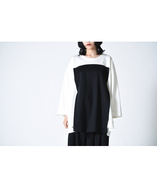 前身頃でスクエア状に切り替えたMy Beautiful Landletらしいゆったりシルエットのカットソー。 ドロップショルダーで身幅もゆったりとったデザインのため、フリーサイズ。 ほとんどの体型の男女が着用可能。 着用時の独特のシルエットは、ボトムとのバランスもとりやすい リラックスしたラインでスタイルの幅を持つ一着となっております。