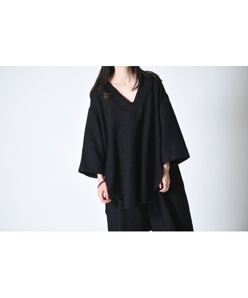 Edwina Horl らしいオーバーサイズのプルオーバー。 和服のような襟が印象的。 贅沢に生地を使用することでゆったりと綺麗なドレープが生まれます。 肩に沿って落ちる柔らかい素材を使用しておりますのでフリーサイズ感覚で着用頂けます。 後ろが長いデザインとなっているため歩くたびに身体と生地の間に空間が生まれます。 使用されている素材はEdwina Horl 2016SS オリジナルファブリック original paper yarn 立体感のある生地なので他にはない独特な表情が出ております。 シンプルなスタイルに加えることで程よいアクセントに。 ボトムスはワイド、スリム共に相性◎の万能トップス。 フリーサイズのような感覚。 ユニセックスで着用可能。 同素材のパンツも展開。 セットアップでの着用もオススメです。