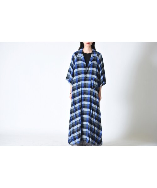 リラックスムードのハーフスリーブワイドコート。 極端にワイドに取られた身幅の生地が重力によって落ちて着用した時に美しいドレープが生まれております。 袖は春夏らしいハーフスリーブ。 冷える日にはインナーにロングスリーブのアイテムを挟むスタイルで、 暖かい日には薄手のカットソーで軽やかに。 肩に沿って落ちる柔らかい素材を使用しておりますのでフリーサイズ感覚で着用頂けます。 使用されている素材はEdwina Horlオリジナルのチェックシアサッカー。 肌触りの良さと通気性の良さが魅力のスプリングテキスタイル。 ユニセックスでおススメ。