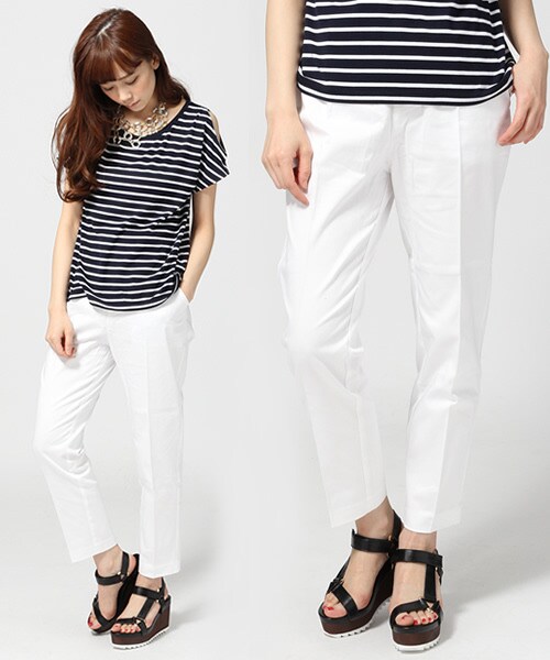 無地と柄のスリムトラウザーパンツです。目を惹く柄ボトムは夏マスト!ホワイトボトムも今年の夏は絶対欲しいアイテム☆スッキリしたシルエットなので、脚が細く綺麗に見えるのがポイントです♪シンプルにノースリーブシャツなどと合わせて、大人カジュアルスタイルがお勧め!