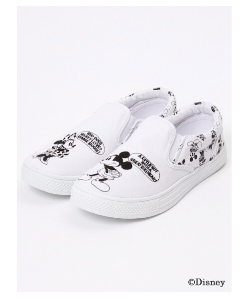 ミッキーマウス、ミニーマウスとのコラボレーション。左右の足それぞれにミッキーとミニーの恋している二人を刺繍で表現したスニーカー!爽やかなキャンバス地を使用したスリッポンタイプ。切り替え部分はPOPな総柄をプリント。他にはない特別なコラボアイテム。