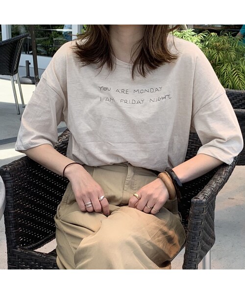 《レタリング Tシャツ》 手刺繍のような味のある刺繍が抜け感を出してくれます。 ドロップショルダーと少し短めの丈なシルエットも魅力。 1枚もっていると重宝するアイテムです。 ハイウエストのボトムスと合わせるスタイリングがおすすめです。 着用モデル 156cm ◼︎カラー ベージュ ◼︎サイズ FREE SIZE 着丈60cm 肩幅61cm 身幅55cm 袖丈21cm ※独自の平置き採寸のため採寸に誤差が生じる場合がございますので、大体の参考までにご覧頂けますようお願い致します。 ◼︎素材 コットン、ポリエステル