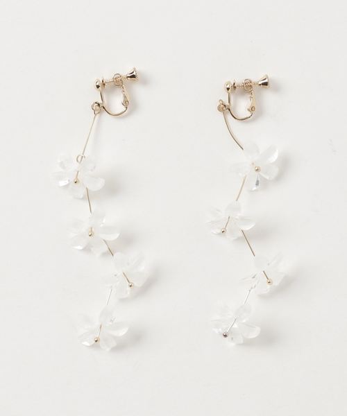 お花が連なる上品で繊細なイヤリング クリアなお花モチーフにラメ入りの白いカラーが施された、シーズンムードあふれるイヤリングです♪