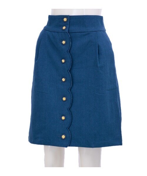 フロントのスカラップ刺繍や、きらりと光るゴールドボタンがフェミニンムード漂うスカート。伸縮性のある綿混素材の使用で履きやすく、腰回りの程よいタック使いが女の子らしいキレイなシルエットを演出します◎ウエストゴムなのでトップスINもバランス良くまとまり、ガーリーなブラウスやカジュアルなTシャツと合わせても可愛い着こなしが楽しめます♪*刺繍部分は大変デリケートな為、お取扱いに十分ご注意下さい。*特殊加工品の為、歪みシワ、色の出方、風合い、サイズ等微妙に 異なりますがご了承下さい。*[ブルー・ネイビー]インディゴ染めによる、色落ち・色移りにご注意下さい。