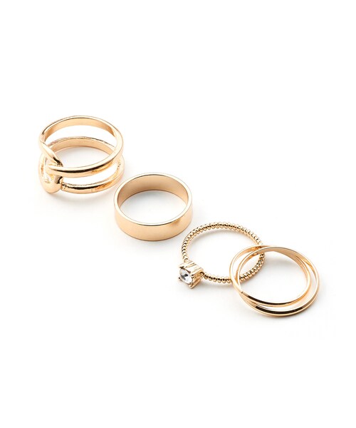 それぞれ表情の違うリングを重ねて、ボリュームのある手元を演出するリング4点セット。 やさしいゴールドカラーが、女性らしさを惹き立てる。 ポイントにつけたキラリと光るビジューもリッチなポイント。 シングルユースもできるので、シーンによって使い分けて。 ★素材の特性上、カラーが、写真と多少異なる場合があります。