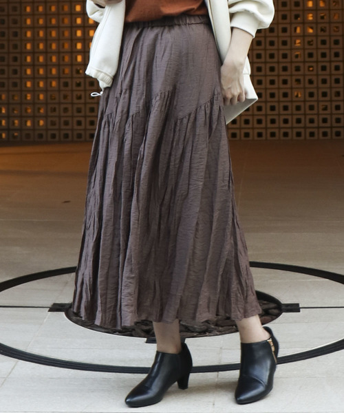 ナチュラルなカラーが今年らしい♪ 着まわし便利なギャザースカート<素材>シボ感が今年らしい、レーヨン、ナイロンローン素材。タテに細糸であるナイロンモノフィラメント糸を使い、独特なハリと、ナチュラルな凹凸感を出しています。ふんわりした素材感が魅力です。<デザイン>ジグザグと切替えた、ティアードデザインがポイント。ウエストはゴム仕様なので、ストレスのない着心地。生地の凹凸感に加え、縦にしわが入るように仕上げ、清涼感を演出しました。