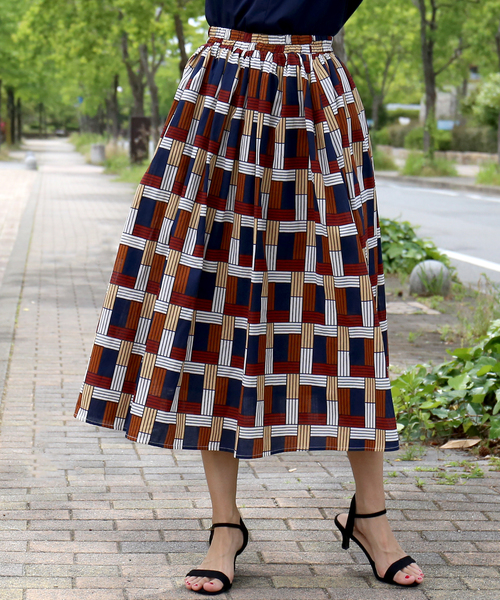 旬の、ブロックがクロスしたチェック柄が登場☆ チョッピリレトロ感のあるフレアスカート。 大人女子の出勤コーデにもぴったり。 コットン混なので暑い夏も着心地良く快適に過ごせます。 ウエストはゴム仕様でストレスフリーで着て頂けるのも嬉しいポイント♪ 座り仕事が多くても、長時間の移動も楽チンなアイテム。 女子会や、デートなど、食事の席でも苦しくないのにキレイコーデに。 Tシャツやブラウスに合わせて着て頂くのがおすすめポイント☆