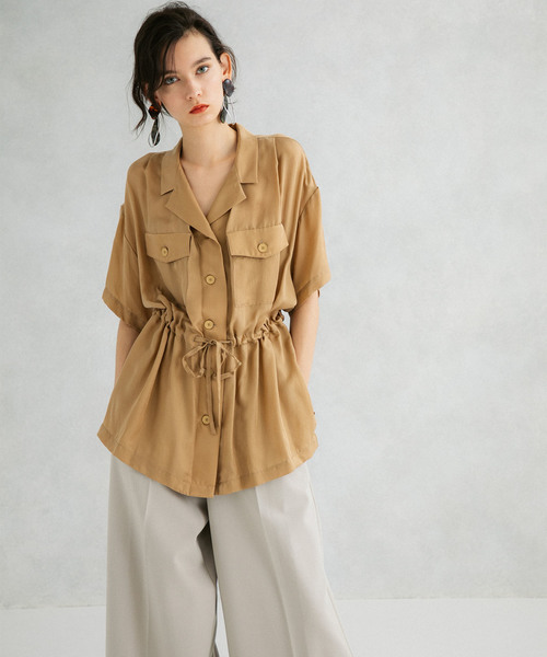 ビッグシルエットのオープンカラーで出す大人の抜け感■素材 トレンドのキュプラ素材で品のある光沢感としなやかなドレープが美しい素材です。■デザインオープンカラーでデコルテをすっきり魅せながらラフに着れるジャケットブラウスとしての実用性も兼ね備えています。 ゆったりとしたビッグサイズとユーティリティデザインが今季らしく、ウエストの紐でブラウジングすればコンパクトなボトムスとも相性よく表情多様なスタイリングが可能です。ニットパンツでリラックススタイルは勿論、スキニーでのカジュアルコーデもおすすめです。